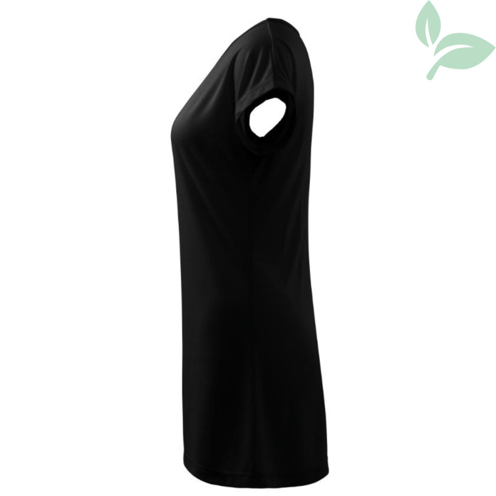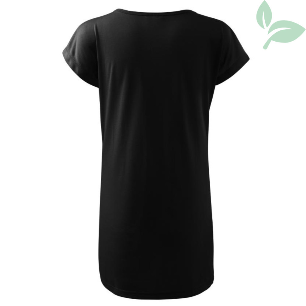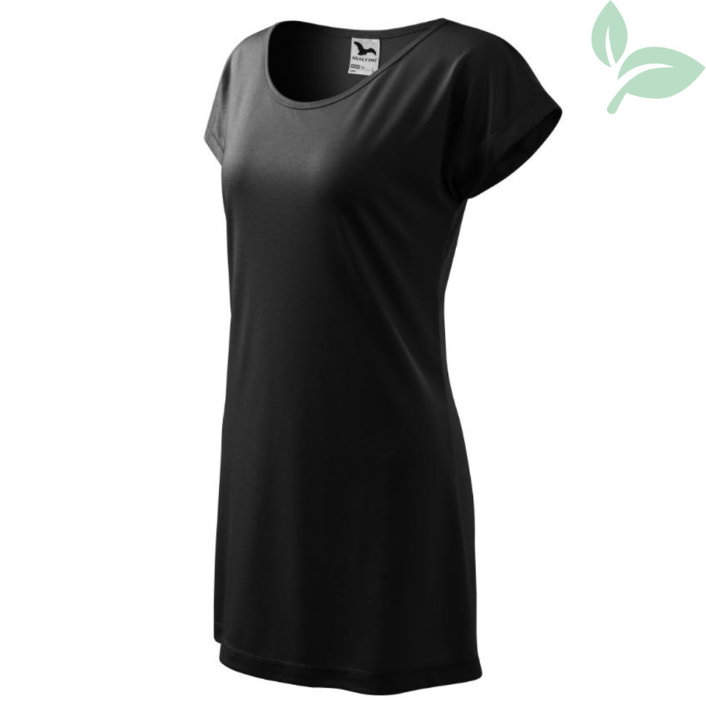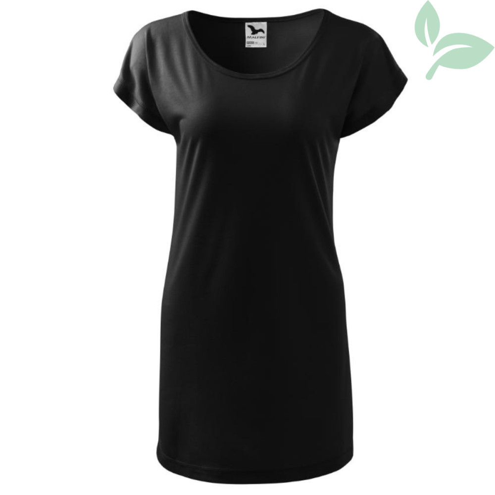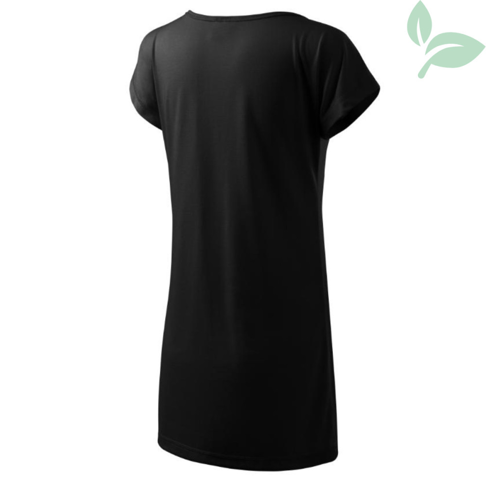 Japán ujjú, laza szabású pólóruha csípővonal alá érő hosszban. Csónak nyakkivágással készül, melyet saját anyagával szegtünk körbe.