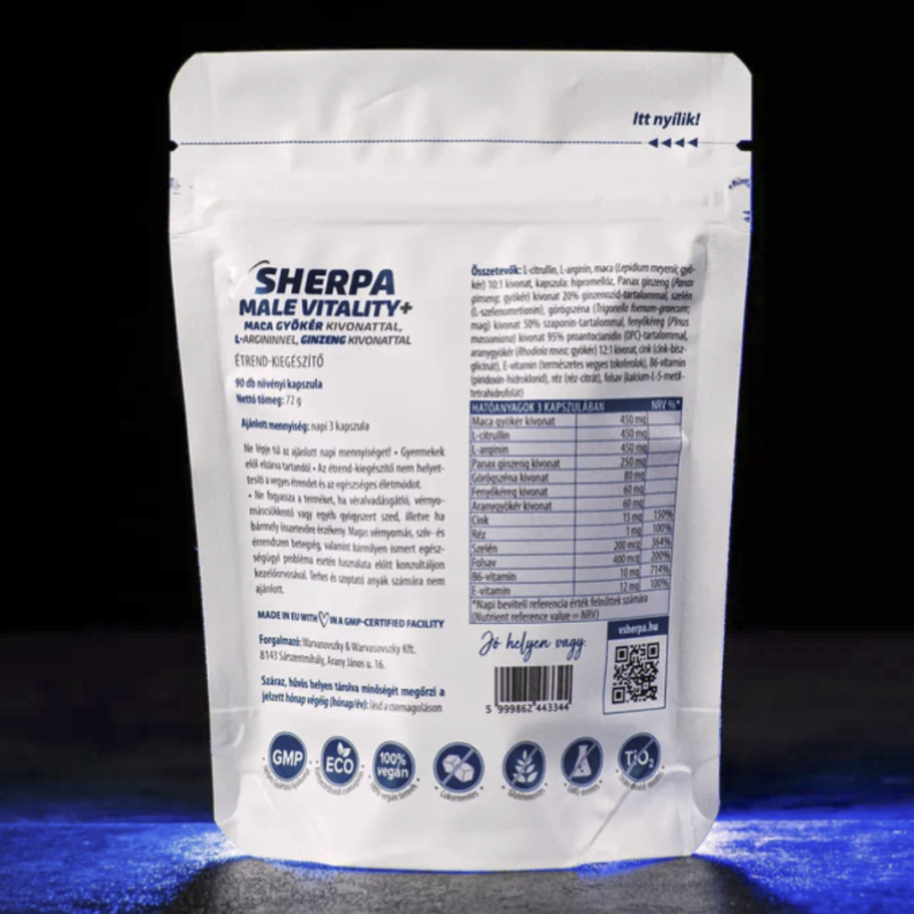 A vSherpa Male Vitality+ egy tudatosan összeállított, komplex férfi formula, amely a hormonális egyensúly, a vérkeringés, a fizikai teljesítmény és a mentális vitalitás optimális működését célozza. Célja, hogy helyreállítsa a szervezet természetes hormonális és keringési ritmusát, támogassa a tesztoszteron-termelést, az izomteljesítményt és a spermakép minőségét, miközben hozzájárul a stressztűréshez, a sejtszintű regenerációhoz és a szexuális egészséghez – mindezt a legújabb tudományos kutatásokra és a természetes hatóanyagok szinergiájára építve.